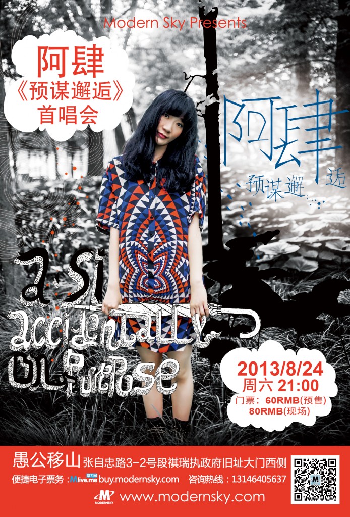 ASI, the most anticipated musician of Modern Sky released debut album Accidentally On Purpose on 25th July 2013. ASI will have her first concert in Yugong Yishan on 24th August.