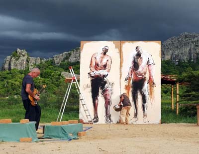 The guitarist Serge Teyssot-Gay – co-founder of Noir Désir (the most famous French band ever) – and the Breton painter Paul Bloas – street artist – cross swords during a performance subduing a vast audience. Same age, same shaved head and especially same integrity. In one hour, accompanied by Serge Teyssot-Gay’s improvised riffs, Paul Bloas paints two polychrome four-meter-high silhouettes. 60min performance.