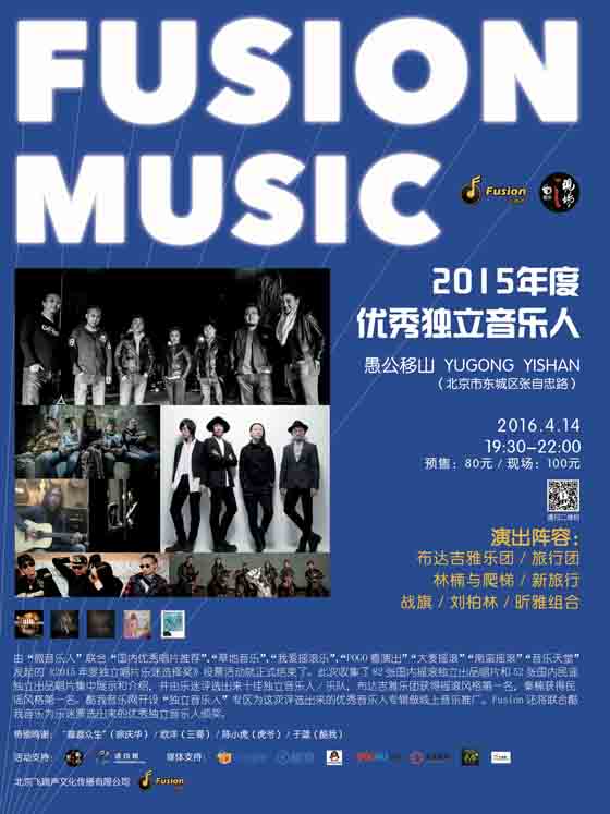 Fusion将联合酷我音乐,为在这场演出中为被乐迷评选出来的优秀音乐人颁奖,鼓励并希望所有独立音乐人,继续创作出更多更好的作品!获得“摇滚&金属”风格票选第一的布达吉雅乐团,新专辑正在制作中,不久之后就会在酷我“独立音乐人”专区独家首发,敬请乐迷关注!此次活动专门为旅行团乐队设立特别环节,旅行团乐队成军十年间,用优质的音乐培养了大批喜爱他们的乐迷,2016年即将开启全国校园、剧院巡演。4月14日来现场的朋友,有幸可以在演出结束后,领取一张旅行团乐队为回馈乐迷特别赠送的2016新版签名照片(数量有限,送完为止),先到先得,你准备好了么?4月14日我们与你一起狂欢!