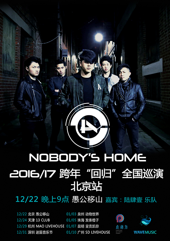 2012年鼓手AJ与吉他 Seven的加入为乐队带来了新鲜血液,不遗余力的演出风格时刻提醒你关注到他们那份对音乐的执着激请。同年应邀成为 Burnswick Music Festival 压轴乐队。 乐队歌曲收录Australia Immigration博物馆。乐队2016年结识活跃在澳大利亚音乐舞台上多年的生力军贝斯手Ricky。为乐队的成长而辗转变化的5个大男孩重新找回自我并全然投身于新的乐队Nobody’s Home,全新EP<<Shadows of hyenas>>收入6首歌,曲风多变,包含金属,硬摇,古典,金属核等等。乐队自成军以来一直致力于独立音乐的推广,坚持让音乐回归现场,给听众带来视觉、听觉震撼性的音乐体验。